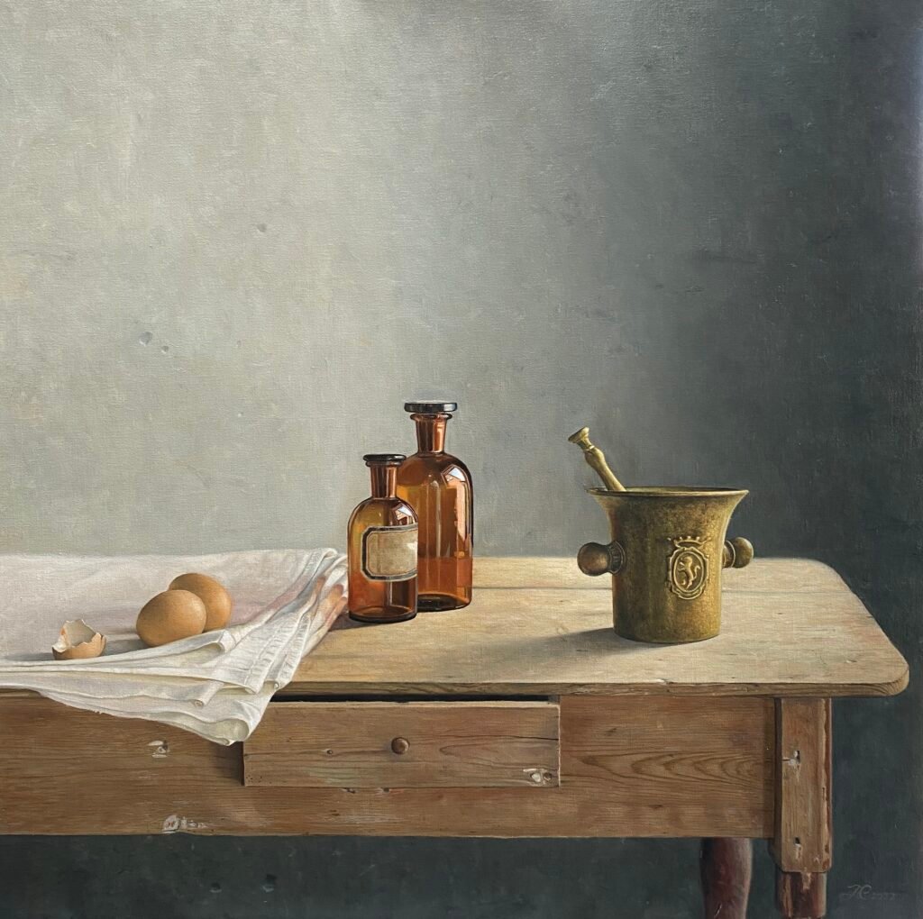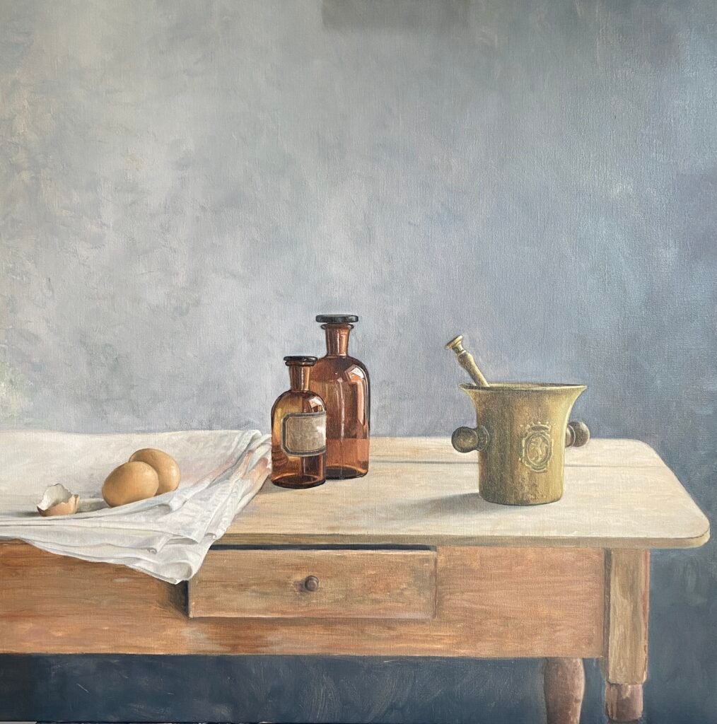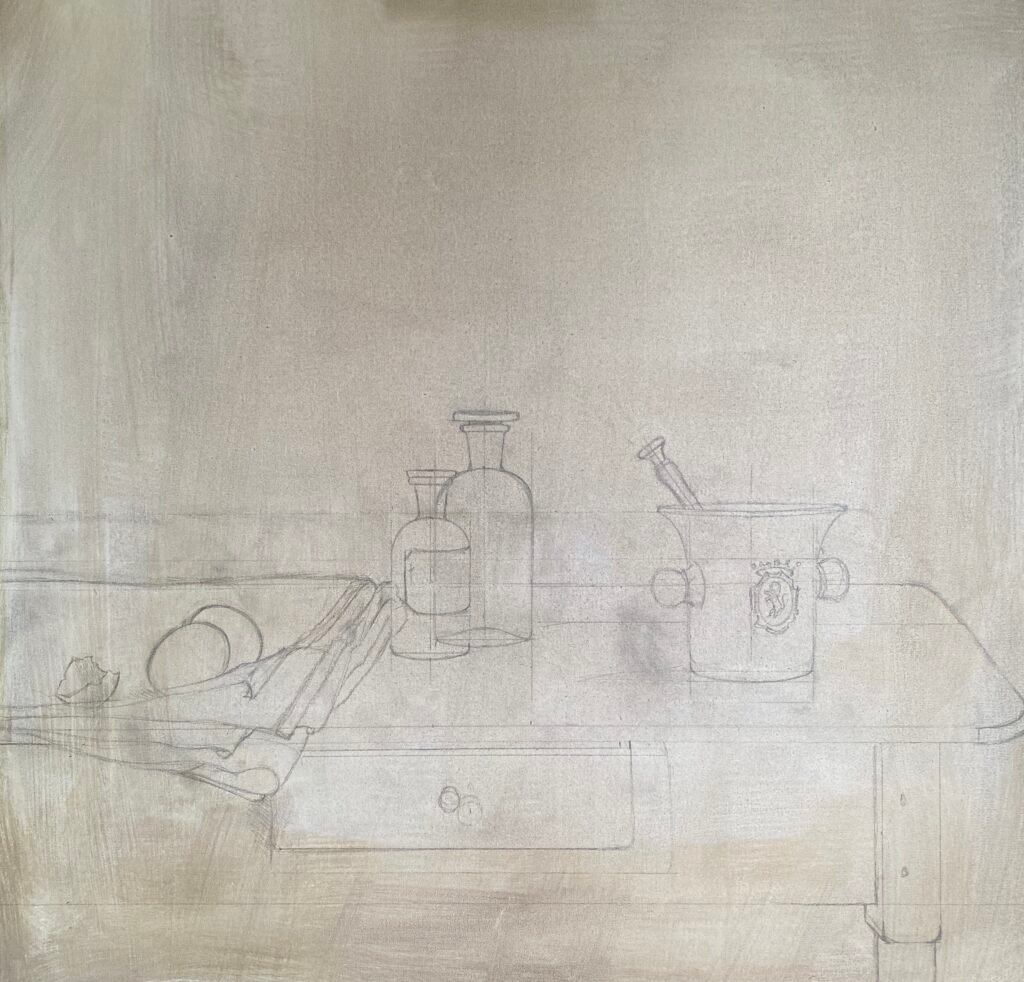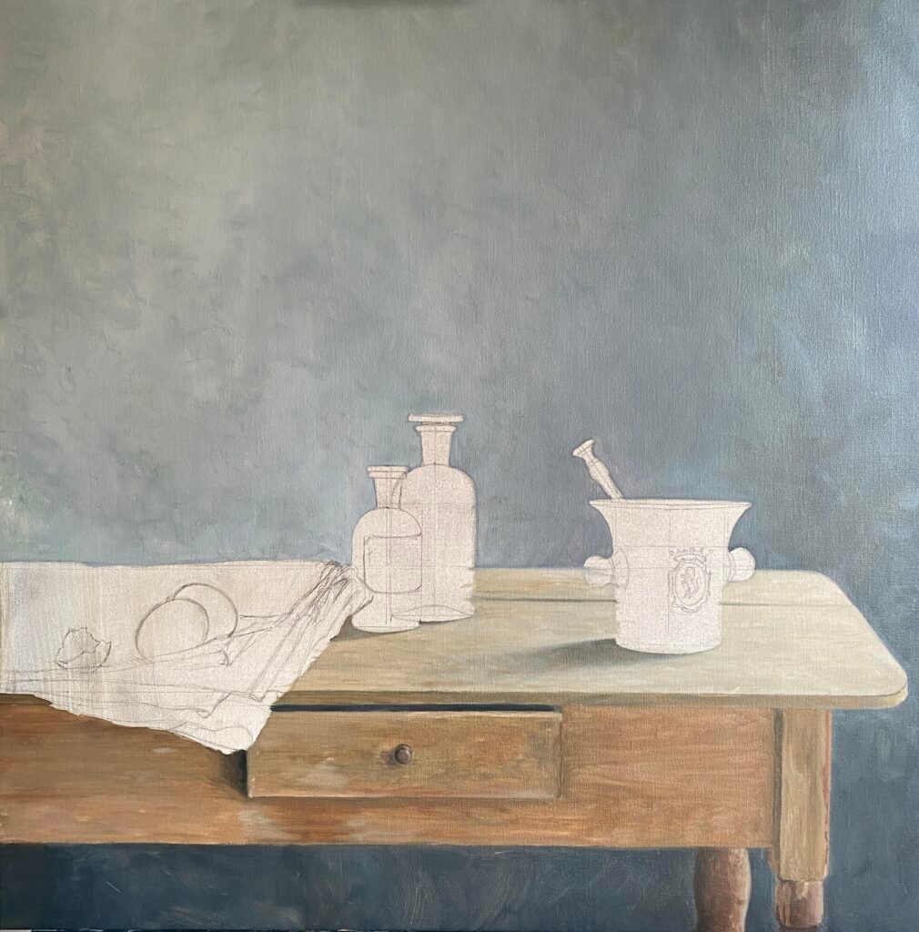 Bijna altijd werk ik vanuit een opstelling die ik zorgvuldig samenstel op een tafel bij het raam — altijd op de noordkant van mijn atelier, waar het licht zacht en constant blijft. Vanuit die compositie maak ik eerst een schets naar waarneming, zodat vormen, verhoudingen en lichtval helder vastliggen voordat ik begin te schilderen.