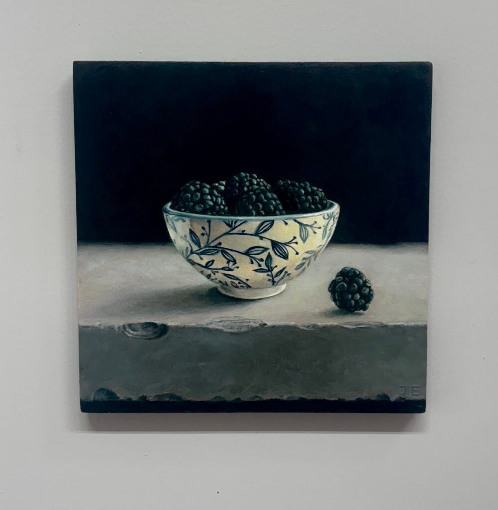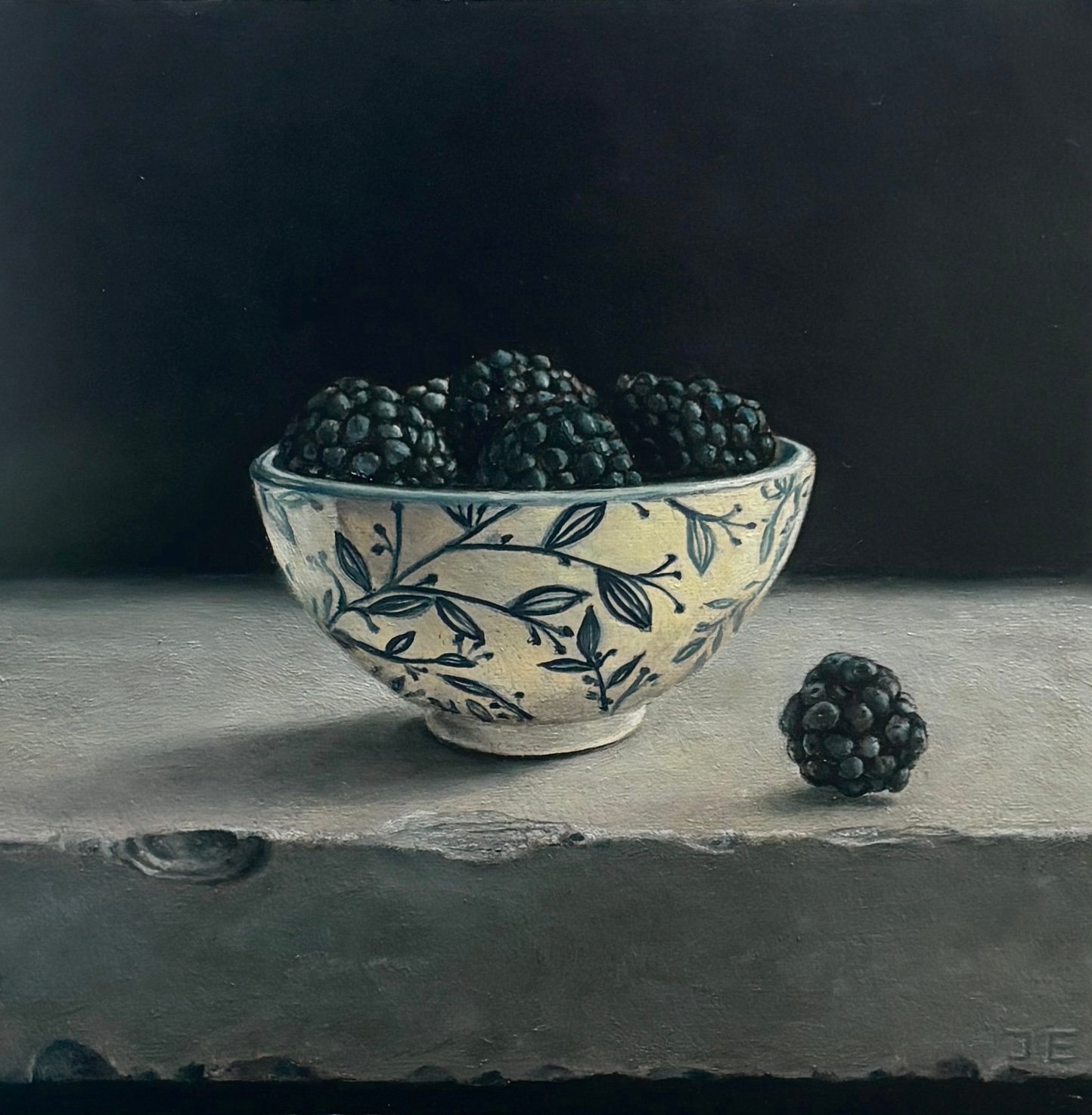 Met een subtiele balans tussen licht en donker toont dit stilleven een kom met bramen, geplaatst op een verweerde stenen rand. De crèmekleurige porseleinen kom is versierd met een fijn blauw takjesmotief, wat een elegant contrast vormt met het diepe zwartpaars van de glanzende bramen. Eén losse braam ligt los op het oppervlak, als een verstild moment van beweging.