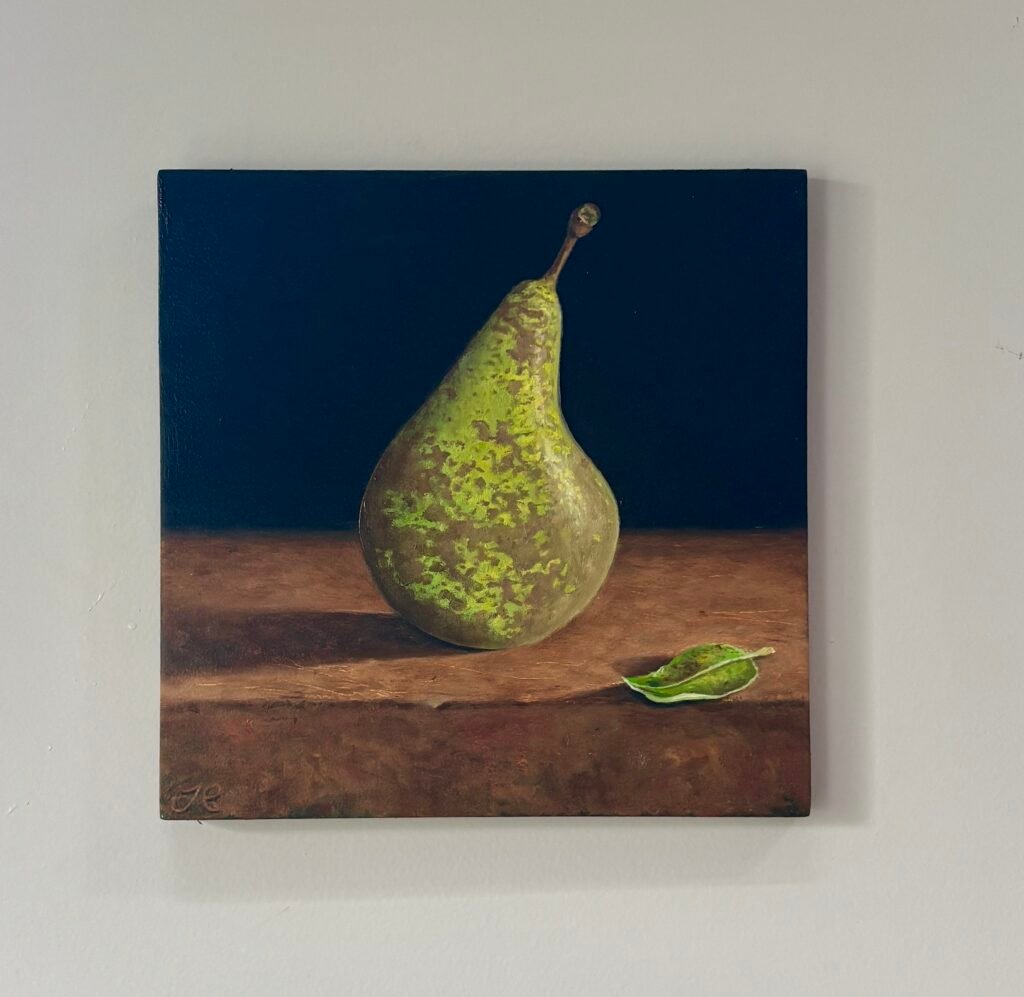Een ode aan eenvoud en verfijning. In dit intieme stilleven staat een rijpe peer centraal, zacht belicht en omgeven door diepe rust. De warme groentinten, subtiele roodglans en een los blad op de voorgrond brengen een stille schoonheid tot leven die je uitnodigt om even stil te staan.