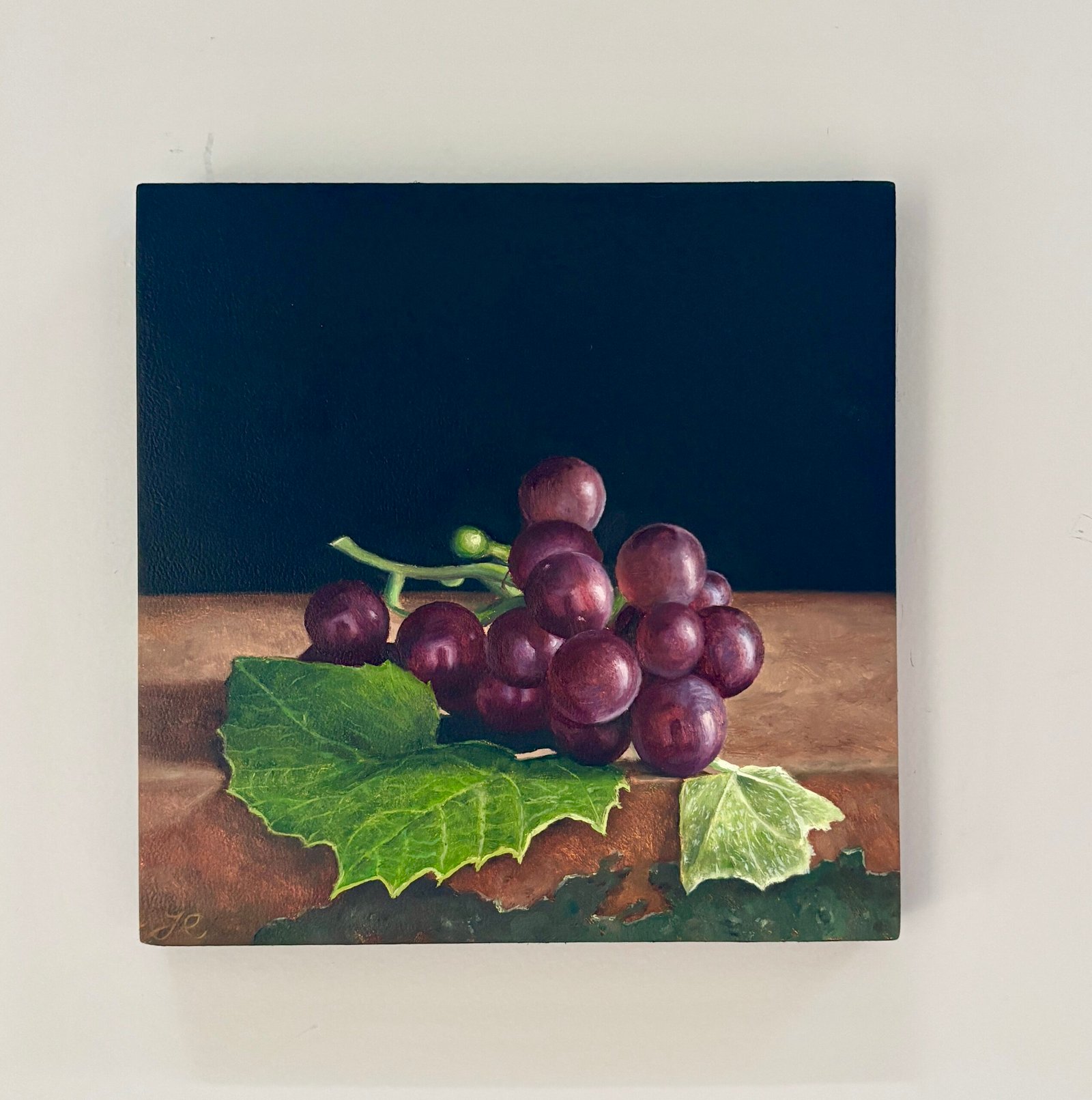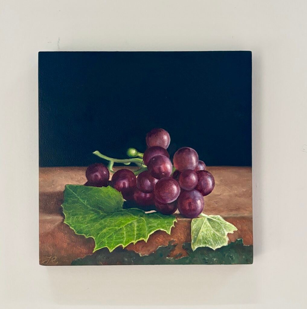 Een trossige pracht van rijpe, glanzende druiven ligt vredig op een verweerde tafelrand – een moment van verstilling, gevangen in verf. De diepe paarstinten, het glanzend oppervlak van het fruit en het frisse groen van de bladeren zorgen samen voor een harmonieus en levendig stilleven.